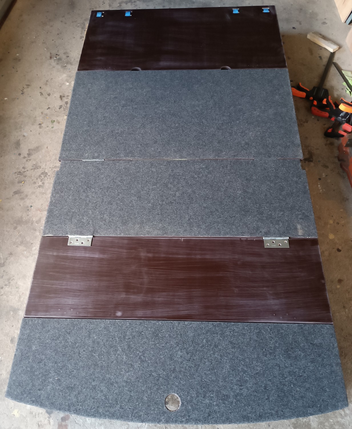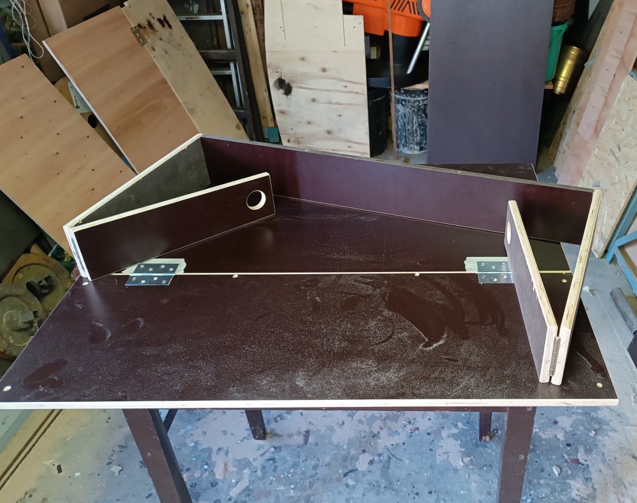 Materiál: voduvzdorná překližka 15mm, bytelnější panty + 16mm dlouhé vruty, 2 malé plechovky chemoprenu, 2,5mm koberec 2x1m, 3m popruhu na zavěšení