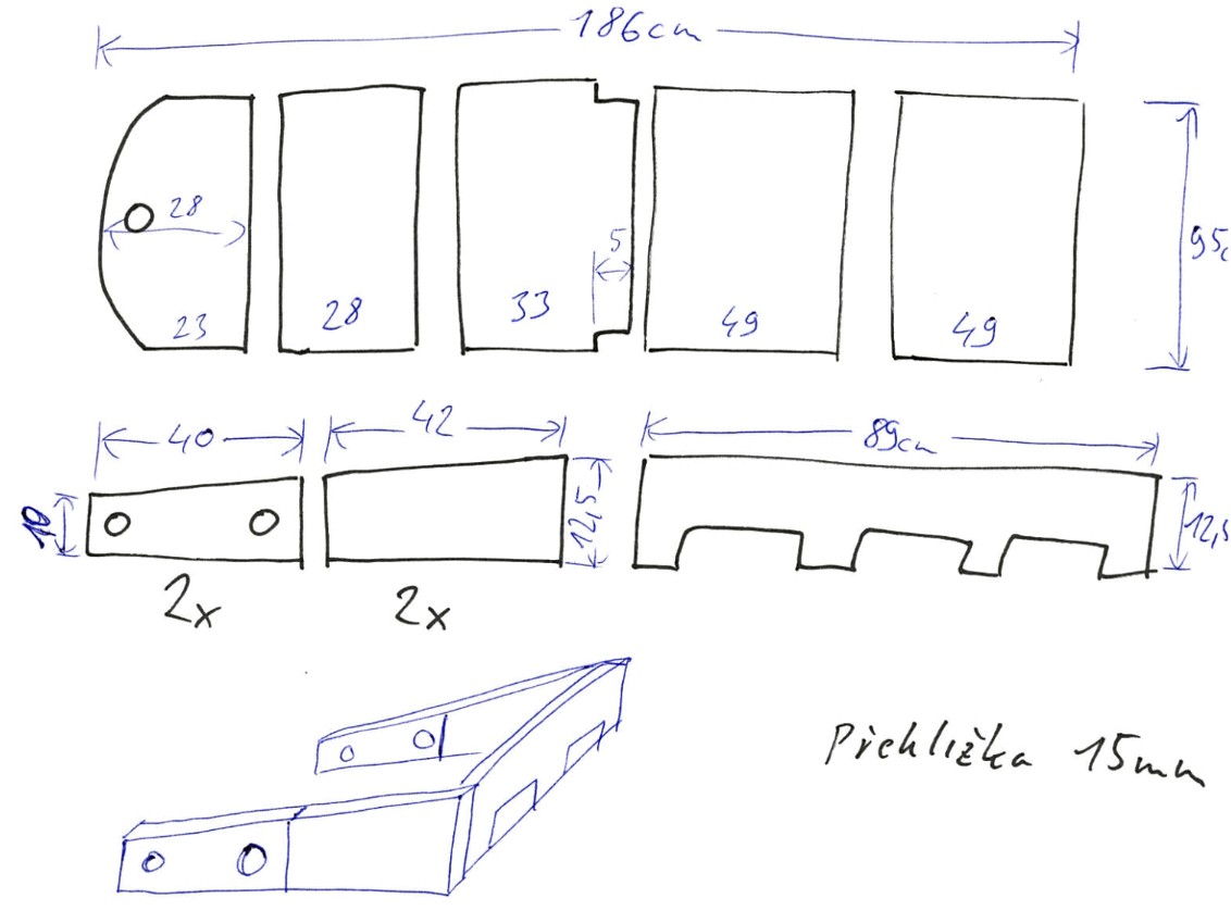Plus vyztužení dvojité podlahy 89x12,5cm a boky 2x 12,5 šikmo seříznuto na 10cm, délka 82cm celkem a "rozpůleno" na 42cm a 40cm.